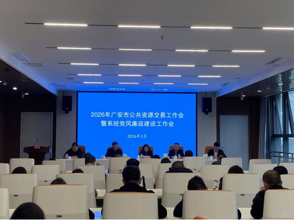 3月27日,2026年广安市公共资源交易工作会暨系统党风廉政建设工作会在广安召开。市公共资源交易中心领导班子成员、市纪委监委驻市政府办公室纪检监察组组长唐和东、各县(市、区)分中心相关负责同志、市公共资源交易中心全体在编干部职工参加会议。会议由市公共资源交易中心党组成员、副主任黄学军主持。